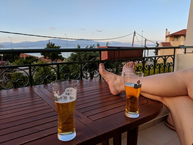 As we count down the last few days of our time in Greece this year, we’re in the middle of the second week of a heatwave. The heatwaves are named like storm systems, and this one is Cleon, an Athenian general in the Peloponnesian War. In Italy the same system is named Cerberus, the three-headed dog that, in Greek mythology, guards the gates of Hades to keep the dead from escaping. (Apparently, meteorologists in Italy have a sick sense of humor.) The scorching heat and the hordes of tourists from Athens overrunning this tiny village make it easier for us to leave. The natural beauty, and the family and friends we will miss make it more difficult. I’m sure there’s a Greek philosopher with wise words about situations like this but I can’t remember them. We have plane tickets, and we’ll use them. And then, when August turns to September, we’ll start thinking about the sweet late summer days of warm afternoons and cool evenings, the mild sea waters, the pastel shading of the mountains across the Gulf, we’ll open a nice bottle of wine from just south of here, and we’ll talk about our next trip.