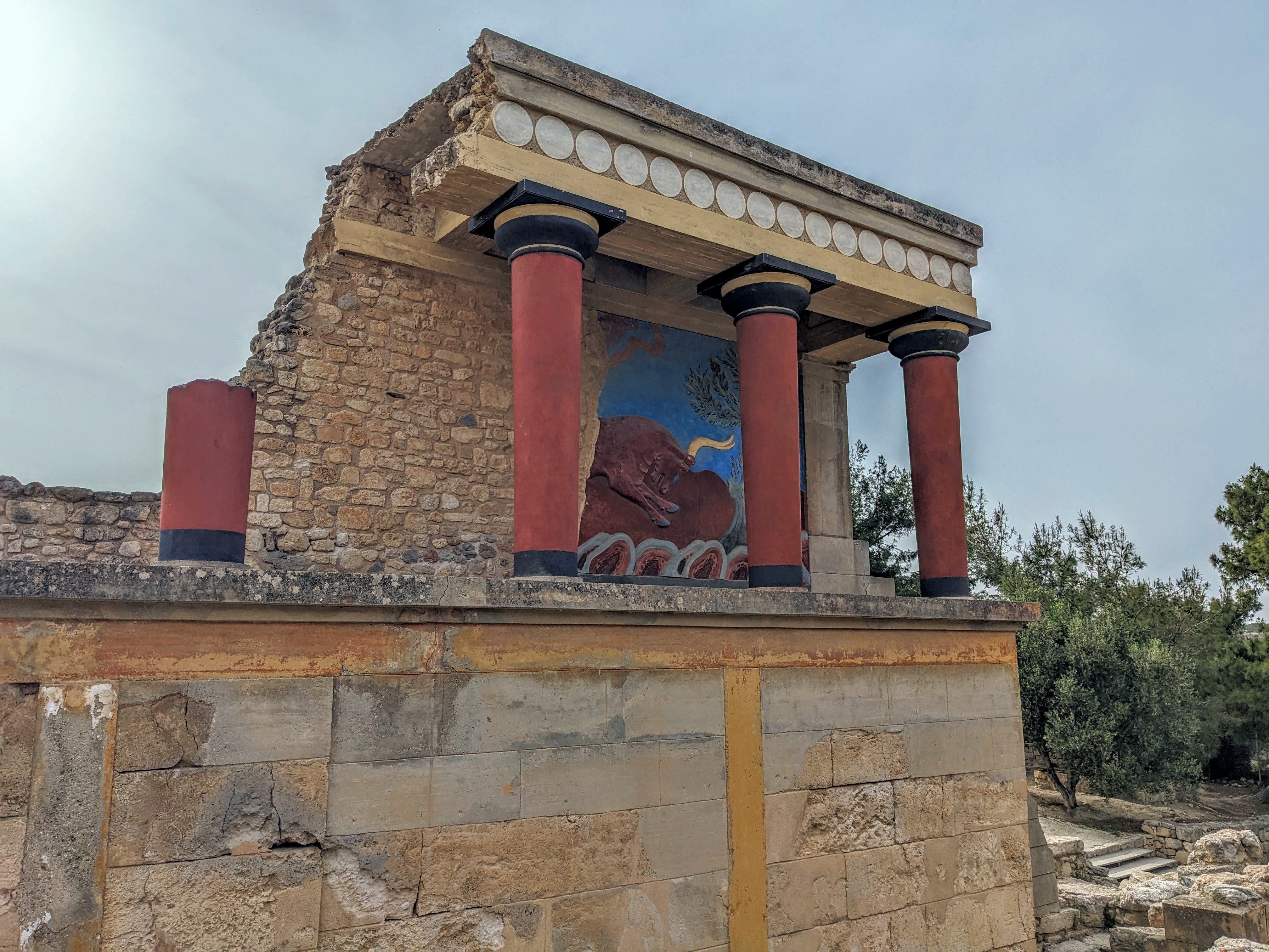 The star of the show in Heraklion is the nearby ruin of the palace of Knossos. Some details such as this have been imaginatively restored to give an impression of the grandeur that once awed the subjects of the kingdom. By legend, the Minotaur, a beast with the head of a bull and body of man, was kept in an elaborate labyrinth under this palace. The palace was constructed circa 1600 BC, making it more than 1200 years older than the classical-era Parthenon of Athens.
