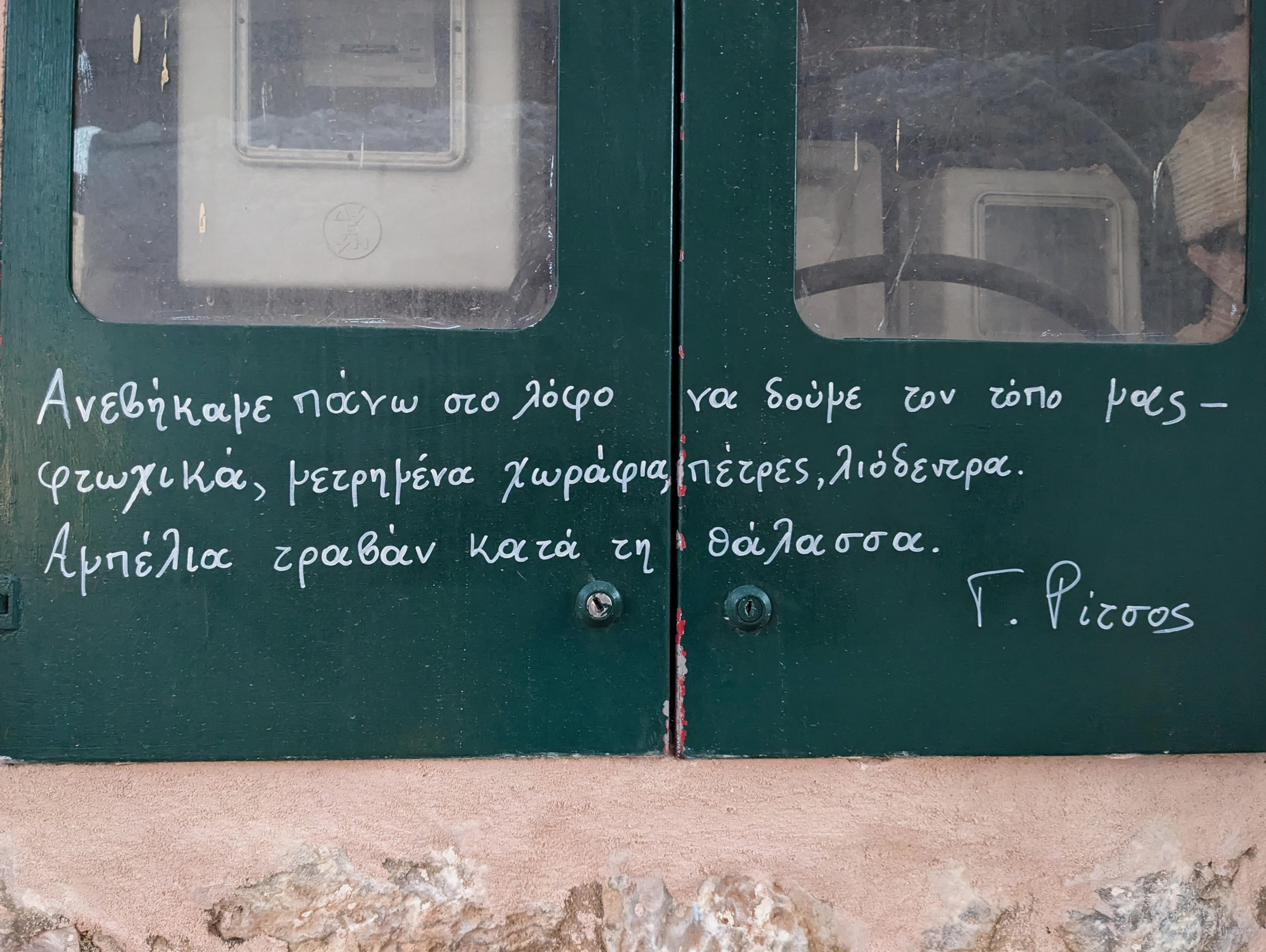 Sitting with family at a cafe in Aeropolis, I couldn’t help but notice this fragment of a poem by Yiannis Ritsos written on the box for the cafe’s power meters. Ritsos is one of the great Greek poets of the 20th century. These are the first few lines of his poem, Our Country, loosely translated as :