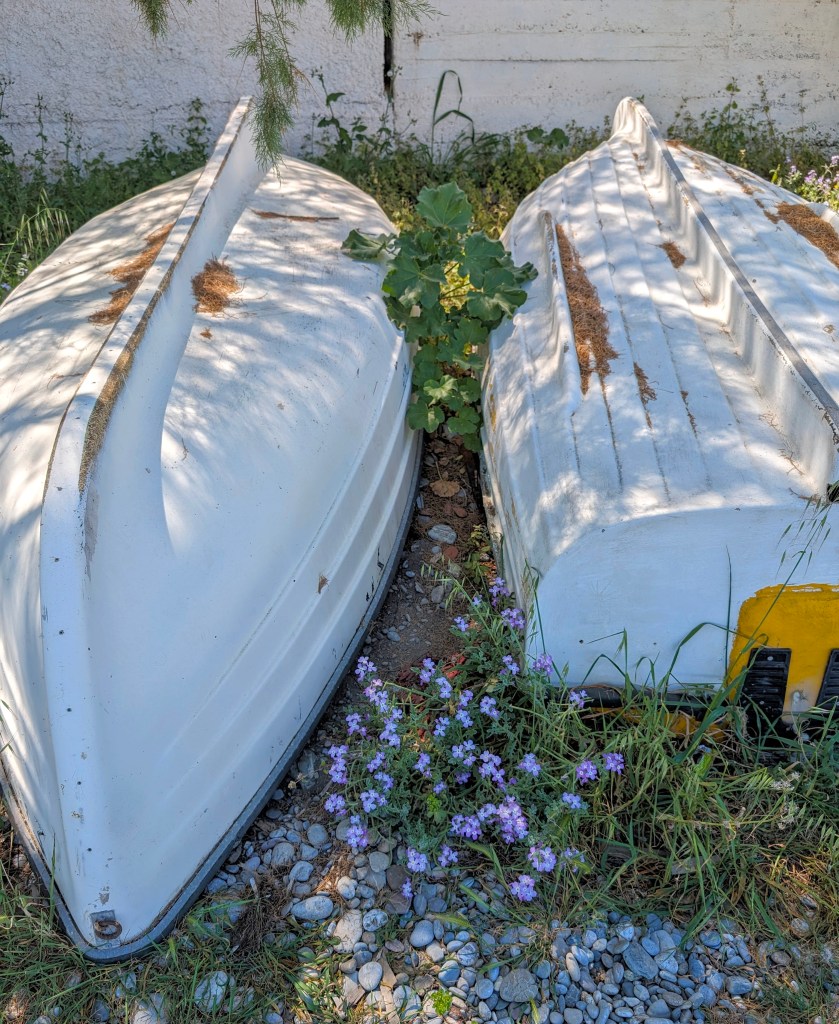 This summer, kids and grownups will be playing on the water in these boats. In the spring, they provide a backdrop for the wildflowers pushing through the beach pebbles.