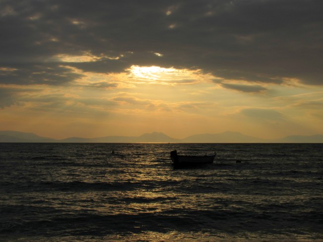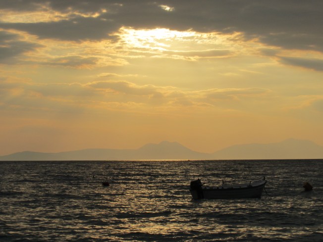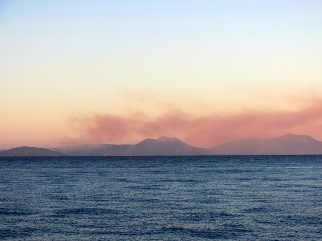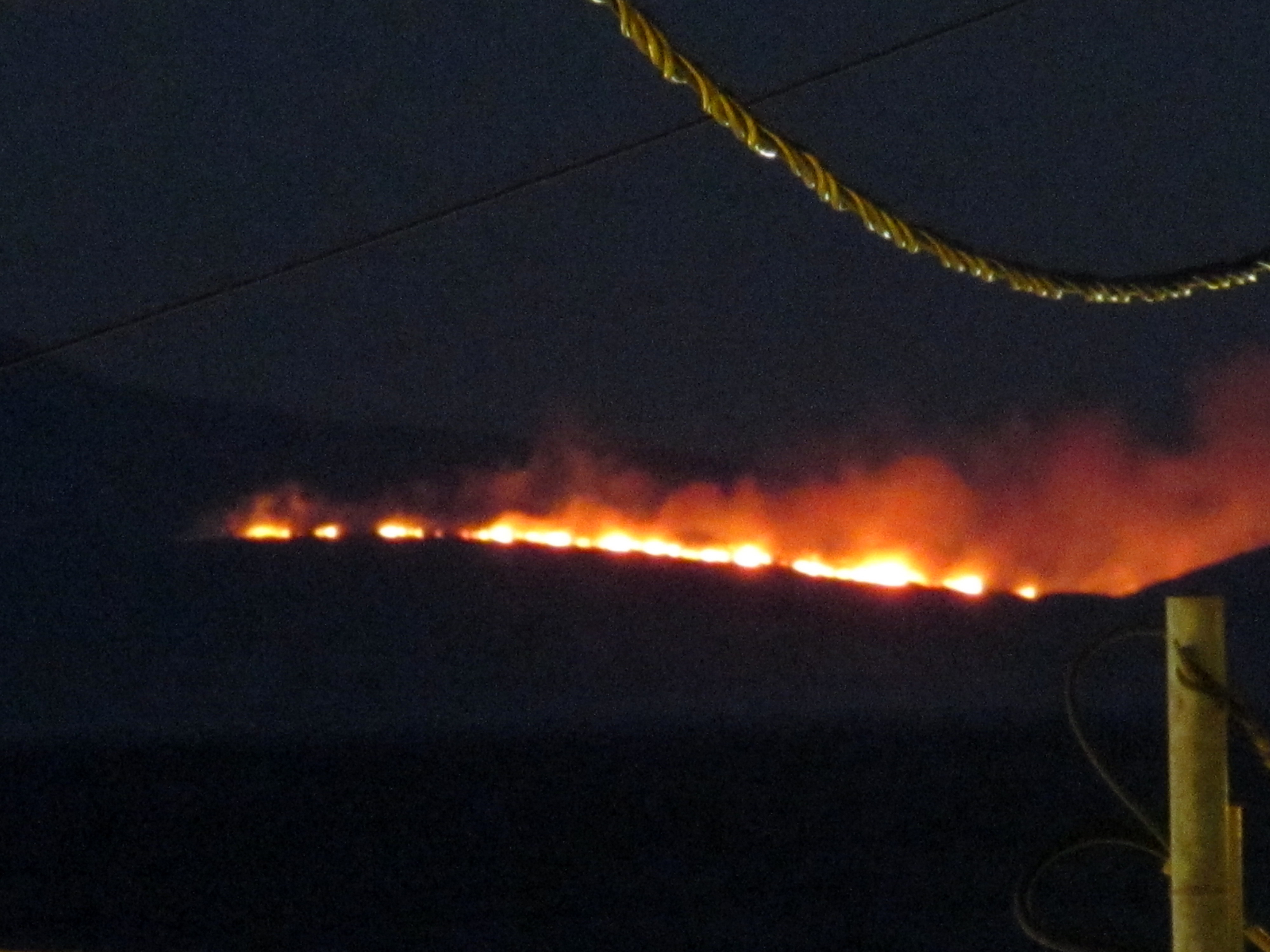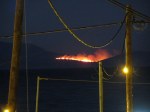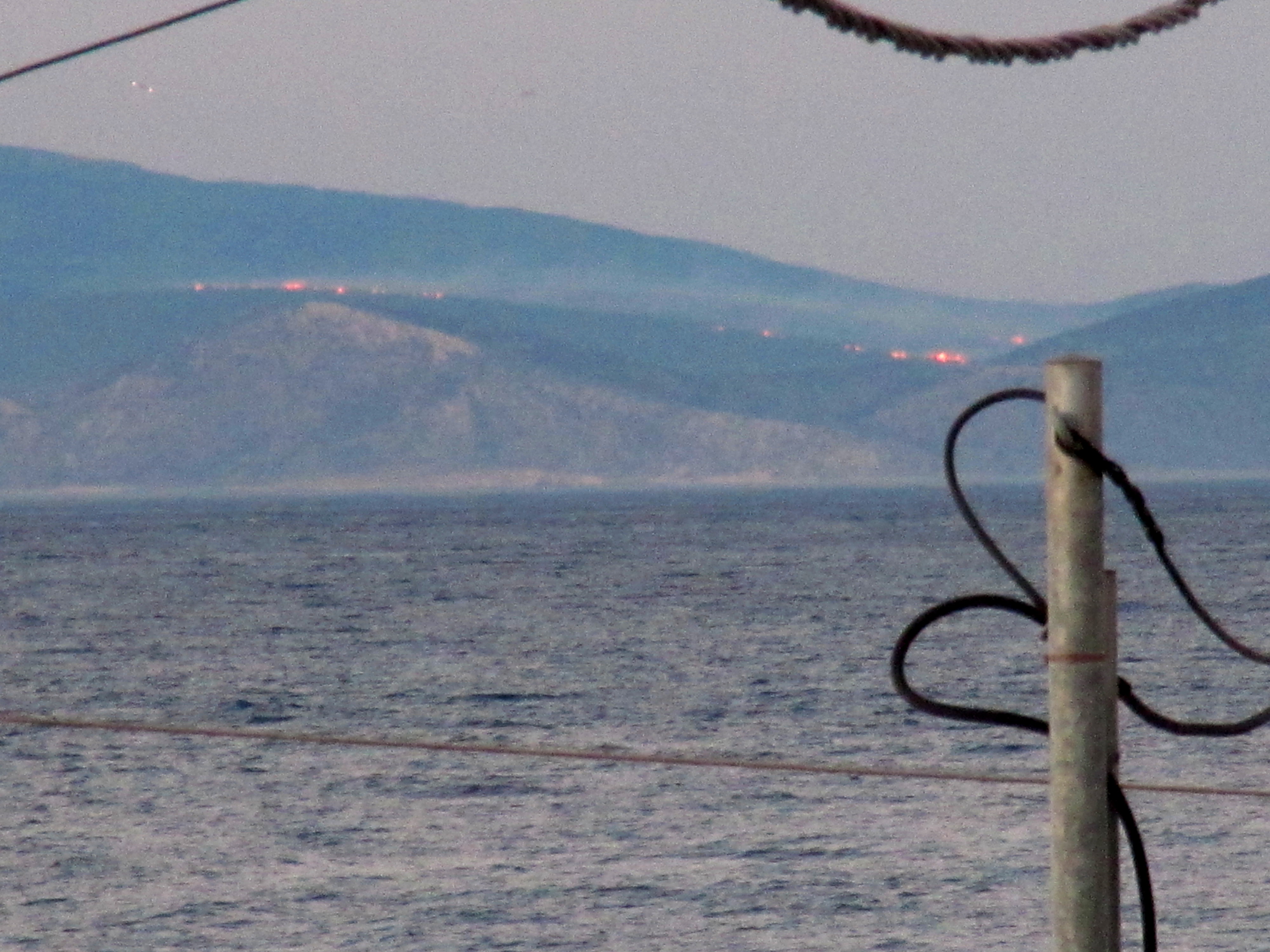 When I went out to the balcony to watch the sunset yesterday there was a plume of smoke in the mountains across the Gulf. I went down to the beach to take a couple of photos. It was obvious a significant west wind was blowing across the fire, pushing the column of smoke sideways toward Athens. When I got back to the balcony the sun had set and in the shadows I could see flames with the naked eye. As the sky darkened, the flames advanced and joined, forming what looked from the south to be a wall of fire. The camera lost its ability to focus in the dark but as midnight approached, the fire seemed to break apart again, presumably having burnt itself out.