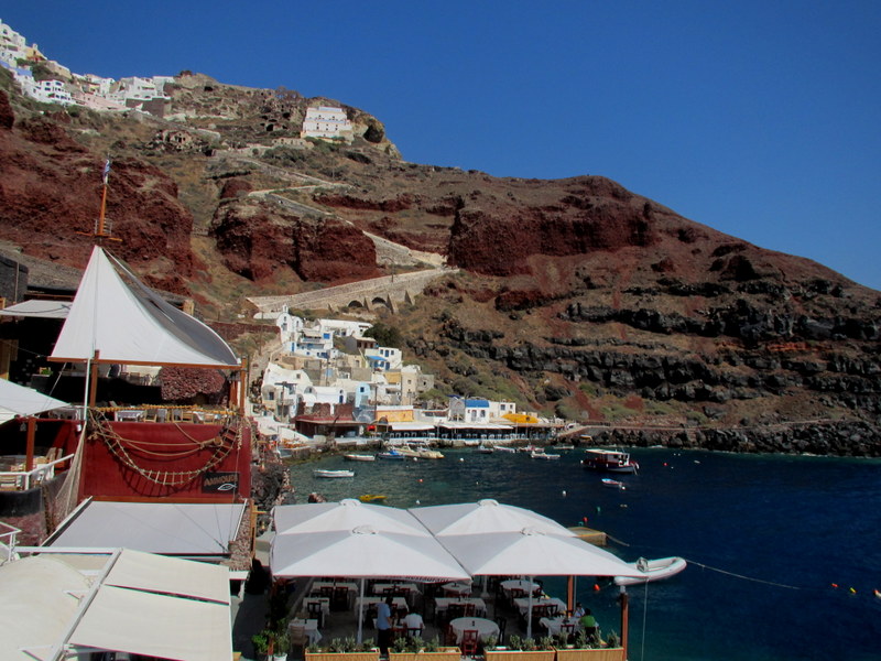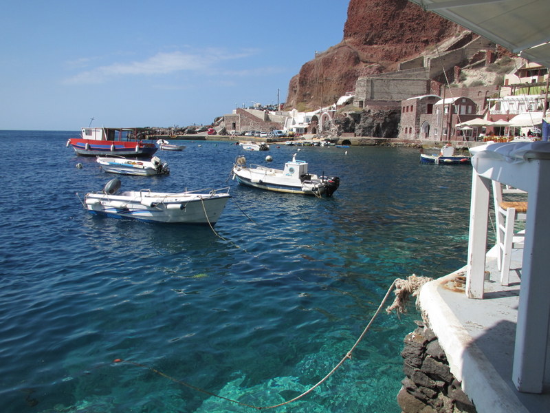 We visited the little village of Amoudi, tucked under the cliff below Oia. Its waterfront is lined with fish tavernas, and we were there for fish. Boat excursions out to the active volcano leave from the dock here.