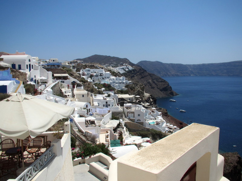 This is the village of Perissa, where we stayed, from way up in Ancient Thera. It’s a small village, with a strip of cafes, tavernas, and shops along its black sand beach. The church that stood just at the base of this mountain, St. Irene, gave its name to the island.