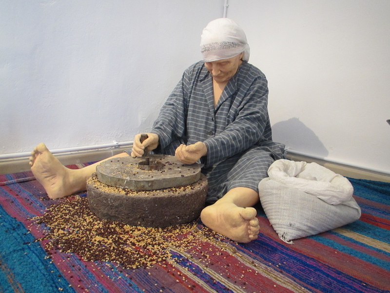 We visited a museum of traditional life on Santorini. Here, a farmer’s wife shells fava beans with a hand mill.