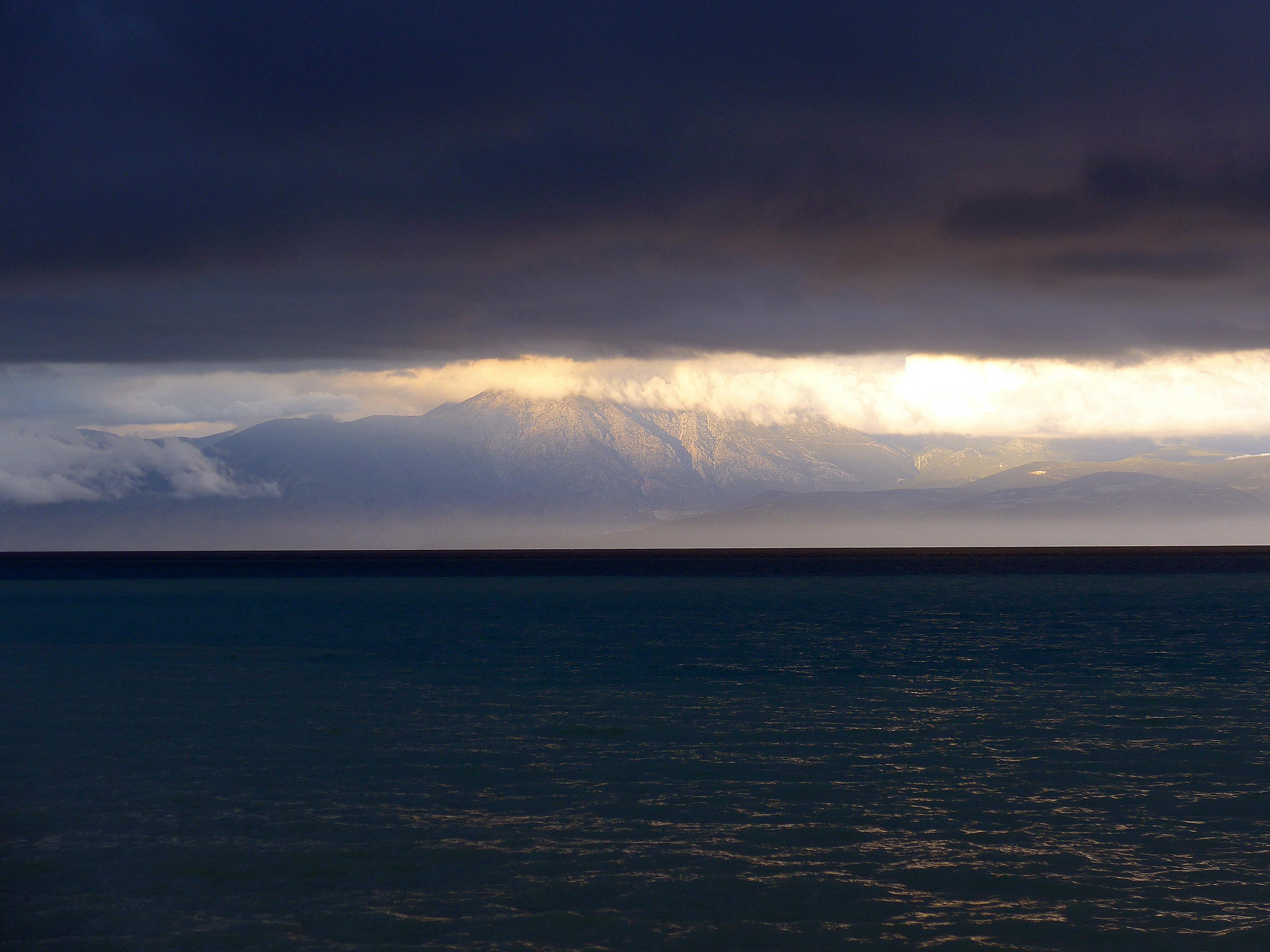Last weekend we visited a little village on the northern slopes of Mt. Parnassos, thanks to a generous invitation from Sue’s cousin to stay at the house he’s built there. Parnassos is the huge mountain we see to the north, looking straight off of our balcony in Sykia. If you followed that line north, you’d arrive first at Delphi, then you’d cross the top ridge of Parnassos, and finally descend the other side to Mariolata, about 45 miles away. Of course, the Gulf of Corinth is a big part of that 45 miles and, without a plane or an amphicar, it took us 3.5 hours to drive around the Gulf to his house.