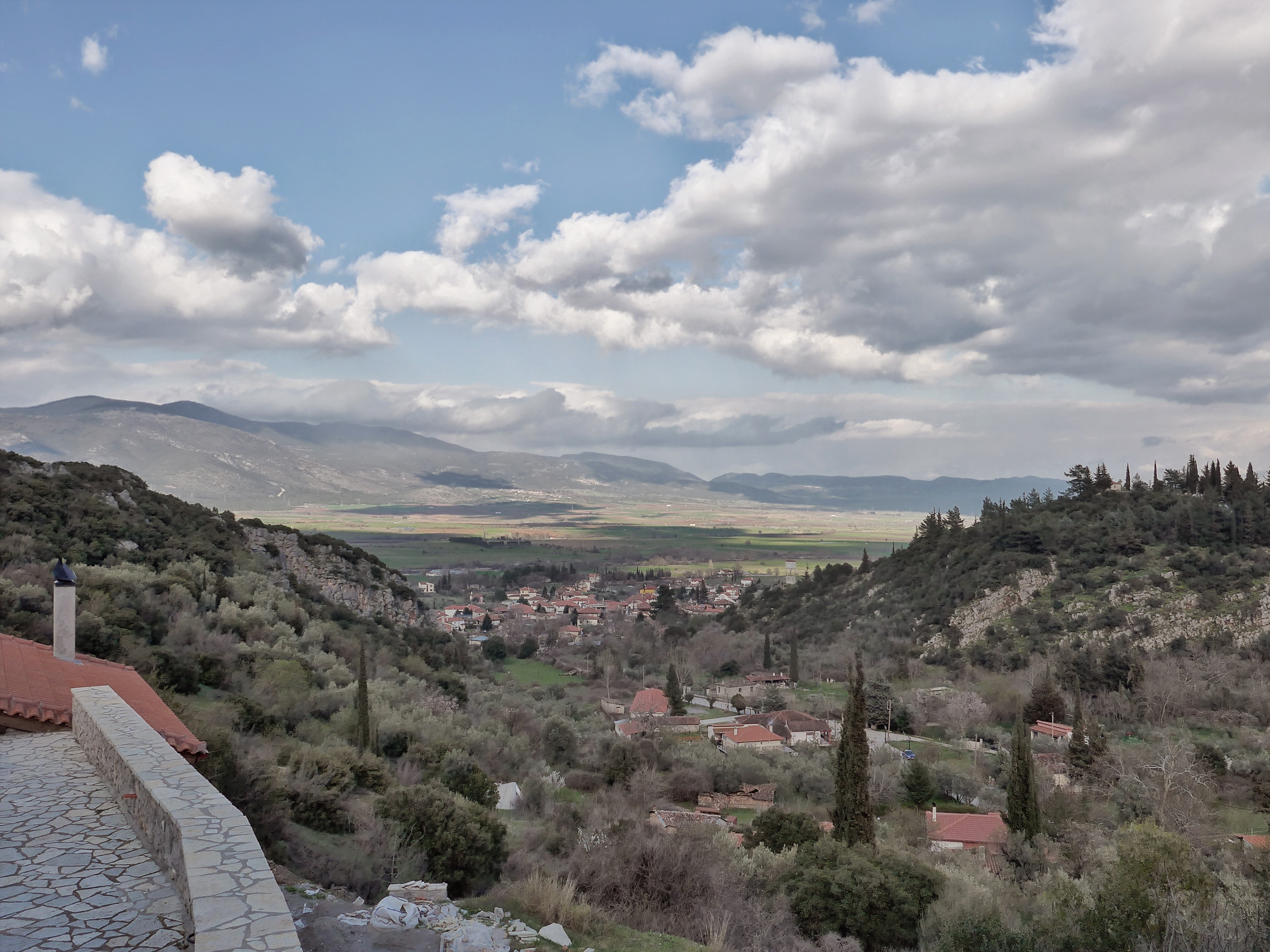 Sue’s cousin built in the upper part of the village, at about 500 meters, and enjoys this spectacular view of Mariolata, and across the Kifissos valley to Mt. Kallidromo.