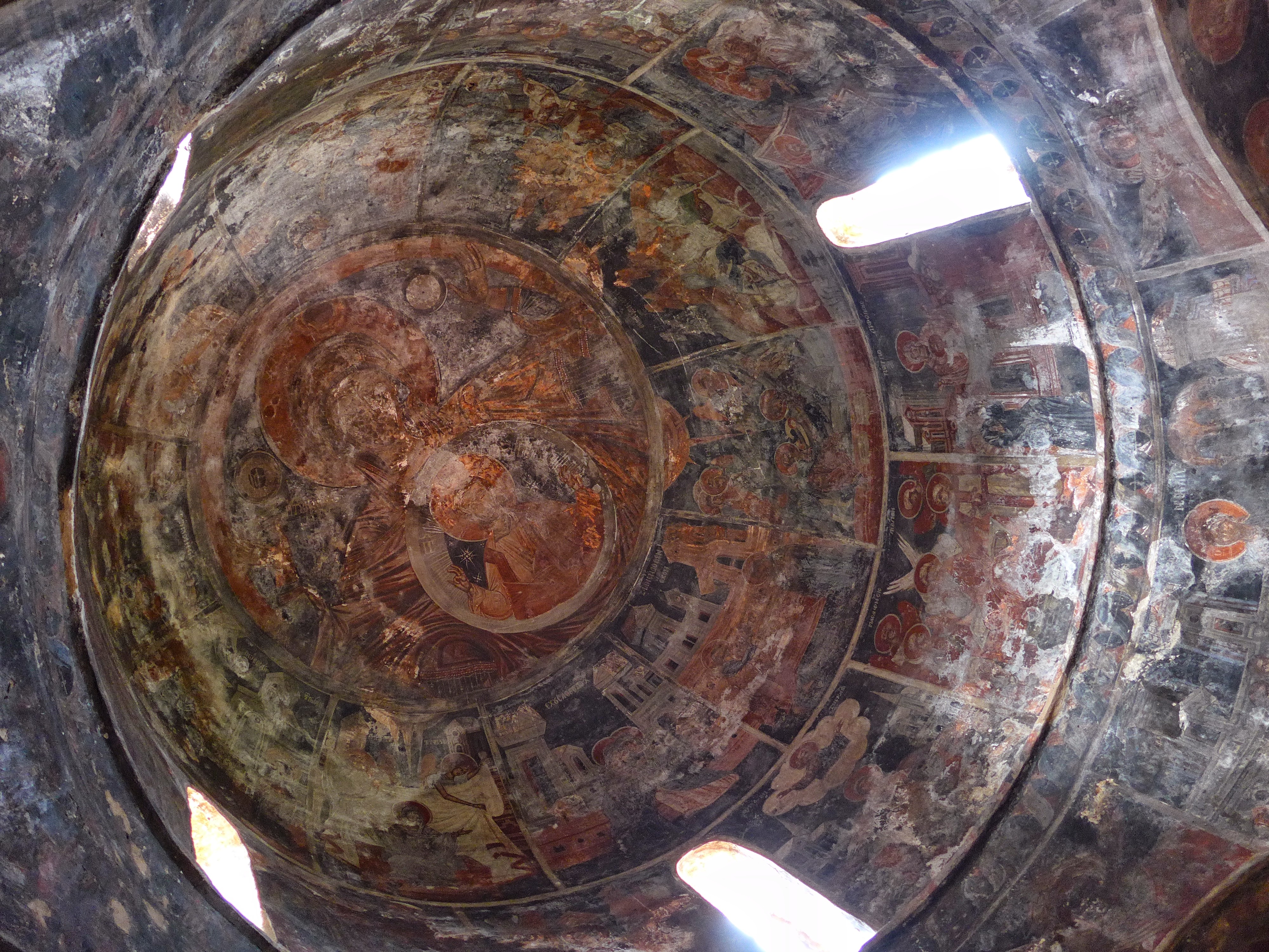 The church is unusual in that it features two domes. At first it appears that the church was built in two phases but indeed it was intended to have double domes from inception. In this photo, the lower dome’s central fresco depicts Mary Pantanasa and the other dome, above the nave, depicts Christ Pantocrator, the usual subject of orthodox domes.